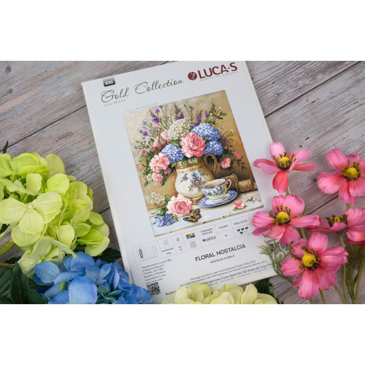 Tikkimiskomplekt hortensiatega. Komplekt sisaldab tööks vajalikke niite, nõela, kangas ja juhendit.