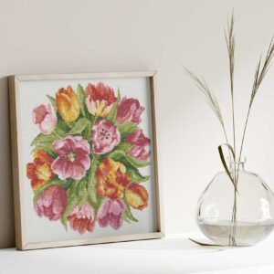 See digitaalne allalaaditav ristpistes tikkimismuster on ideaalne taime- ja lillesõpradele. Õrn värvidemäng ja kaunid õied loovad rahuliku meeleolu. Selle mustri abil saad luua raamitud tikandi või mõne muu dekoratiivse eseme.